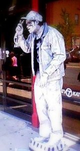 I wish I’d taken a picture of him before, because he’s changed his appearance drastically. Not that my cheap-ass cell phone photo does him much justice anyway. A year ago this MJ mime was leaner, wore a black leather jacket, black pants, a white t-shirt, and one of those studded leather belts. The music on his boom box belted out “Billie Jean” and he danced silently in half white, half black face paint. He drew a crowd. He was good. I put a dollar in the bucket by his feet and he tipped his black fedora.