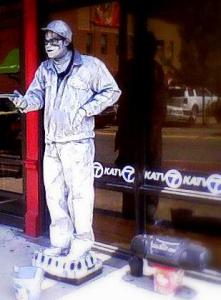 Friday, there he was again. This time the mime had spray painted all his clothing silver. His face was also silver, except for the dark black circles around his eyes. It was almost 100 degrees on Friday at noon and the sun was a demon, but there he stood layered and painted without breaking a sweat.