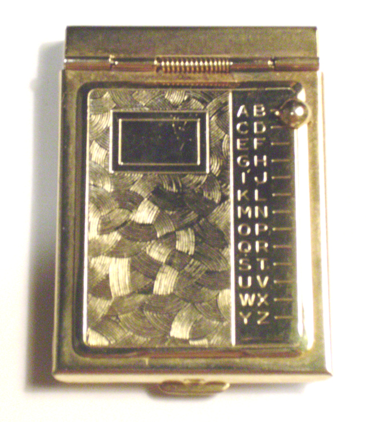 Well, I’ve been on Ebay again. And look what I found…this is a tee-ninsy woman’s address book – just 1 3/4″ by 2 1/2″. It literally fits in the palm of my hand and is so shiny/classy I almost feel like a dimestore starlet. The button beside the letters slides up and down, and when I push the little cigarette case-like button on the bottom the book opens up to just that page. This little address-keeper has no scribbling in it whatsover, and a 1955 calendar on the back of each page. An unwanted gift, maybe, from a beau she didn’t love. Or the one who couldn’t buy her something better.