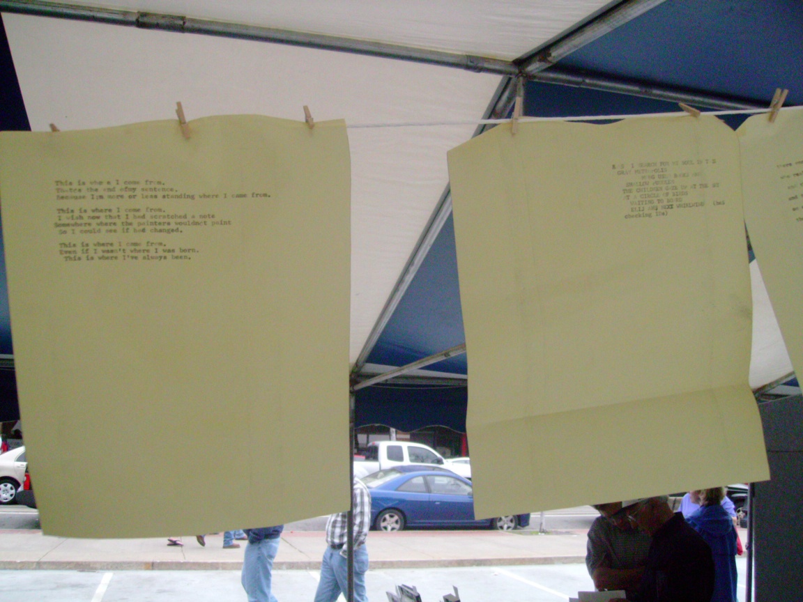 More importantly, we had a typewriter and two reams of manifold paper. Anyone with a hankering to make poetry could sashay by, type a bit, and leave with a finished bit of writing. We strung a little clothesline and hung each poet’s copy with a few clothespins. The storm neared, the winded whipped, and the poetry flowed.