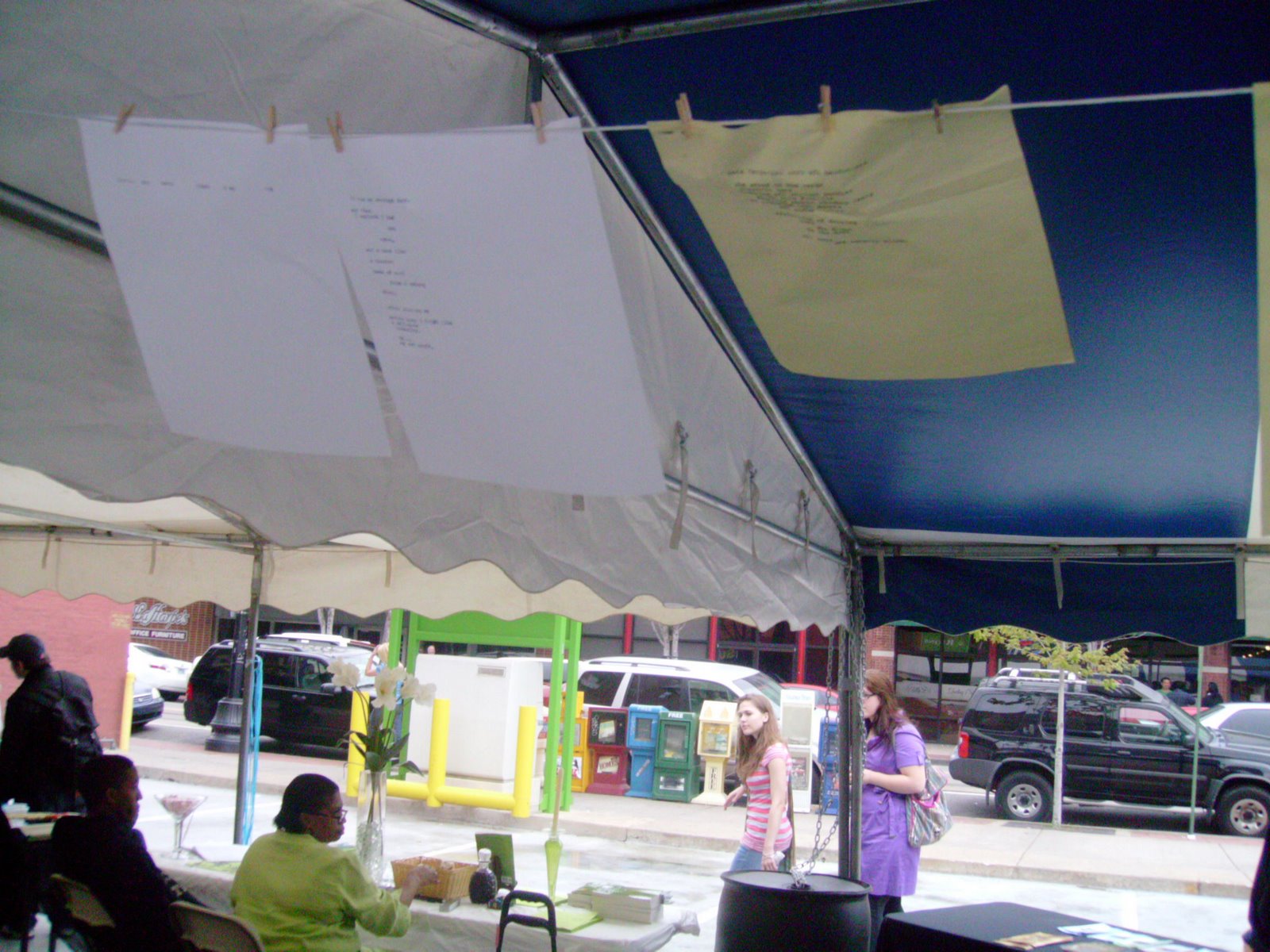 Despite the spitting rain, the Arkansas Literary Festival was in full swing today at the River Market in Little Rock, and the Great Bear Writing Project was there. We manned (womanned) a booth under the tents to greet visiting teachers from all over and to spread the National Writing Project gospel. It’s our site’s tenth anniversary, so we had cake and giveaway drawings and books. Oh my.