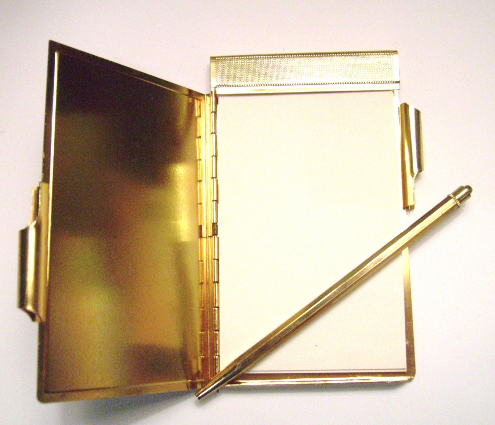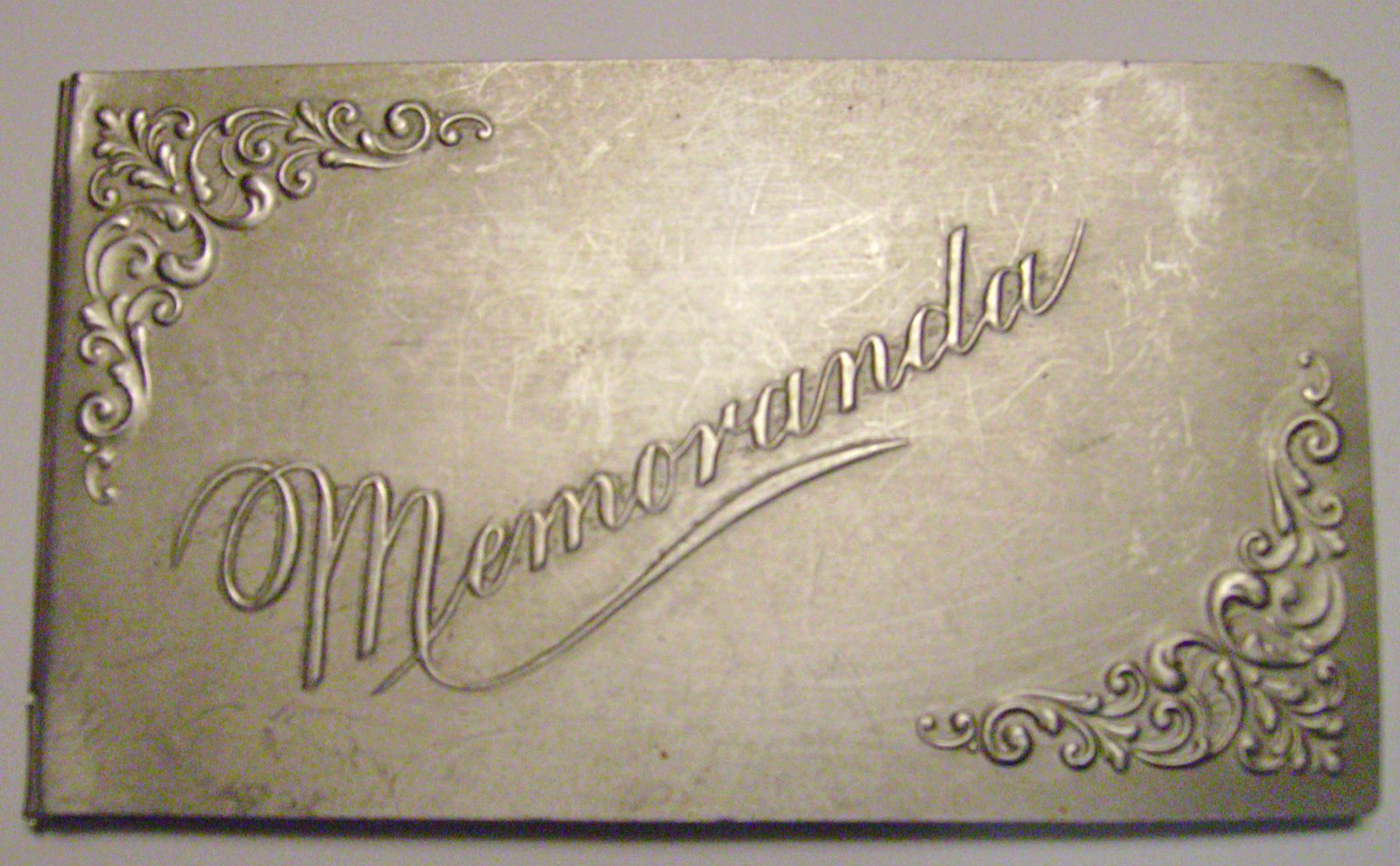 Oh, you can spend a fortune on the real McCoy sterling silver keepsakes, but I’m all about the cheap brass or tin variety. The memo covers are always just this side of classy and don’t seem to tarnish or wear in an unattractive way. The delicate brass pencil is a bit of a problem, though – I can’t seem to find the right size lead. It has to fit perfectly. The whole thing is 2 1/2″ by 4 1/2″ and finding little replacement notepads is no problem at all. It doesn’t appear to have been used much, if at all. only one piece of the original paper is torn off. This little keepsake must have lost it’s initial luster quickly for some reason.